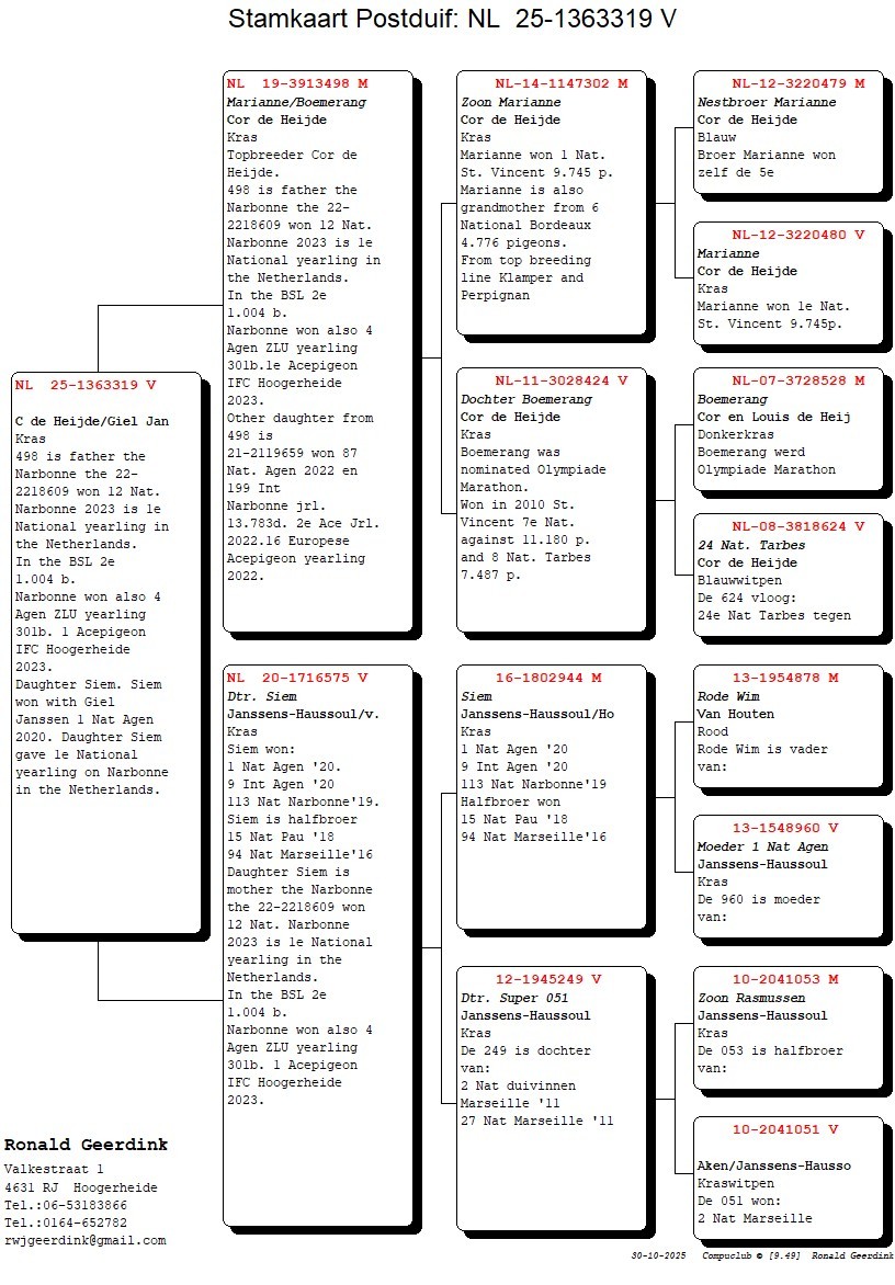 is rechtstreeks Cor de Heijde, komt uit zoon 1e Nationaal St. Vincent tegen 9.672 duiven in 2014. ‘Marianne’ is grootmoeder van de 2e Nationaal Barcelona, 6e Nationaal Bordeaux en 22e Nat. Narbonne. Zus ‘Marianne’ won de 12e Nat. Cahors en de 22e Nationaal Perpignan.