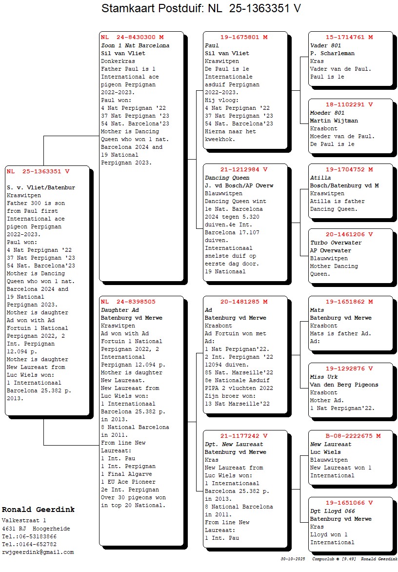De broer van Ad won: 13 Nat. Marseille 2022, 27 Nat. St. Vincent ZLU 2024, 43 Nat. Marseille 2024, 62 Nat. Agen 2023, 65 Nat. Narbonne 2023 en 75 Nat. Marseille 2022. Moeder van de 1e Nationaal Perpignan is ‘Miss Urk’, superkweekster en dochter van 1e Internationaal Pau en 1e Internationaal Perpignan van van de Berg Pigeons.