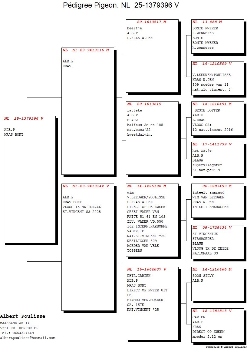 Mother = “RIETJE” winner of the 1st National St Vincent ’25 and daughter of superbreeder (stock breeder) “WIM” (son inbreed “SMARAGD” – direct Wim van Leeuwen x “ST VINCENTJE” 3x 6th National) father of 1st National St Vincent ’25, 16 International Narbonne ’21 and “RATJE” winner of 51 National Pau ’19, 61 National Narbonne ’19, 103 National Pau ’20, etc. “WIM” is paired to daughter “CARIEN” (gr)mother 1 National St Vincent, 2 National Barcelona, 2 National St Vincent, 12 National St Vincent, 31 National St Vincent, 32 National Pau, 185 National Barcelona, etc !!