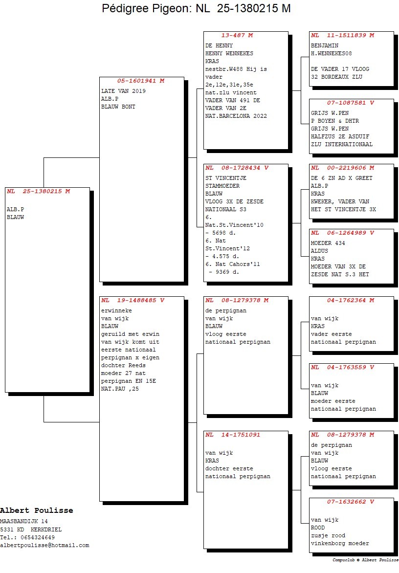 Mother = “ERWINNEKE” mother 15 National Pau ’25, 27 National Perpignan and daughter of the 1st National Perpignan 4.976 ’13 (raced by C.J.J. van Wijk)