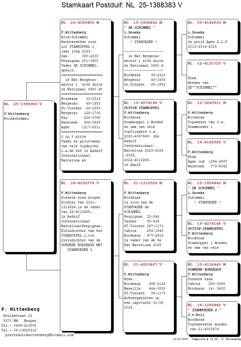 Mother = granddaughter of “STAMKOPPEL I” and halfsister of “RODE AS 2025/RODE 265” 1st International Ace Barcelona – Perpignan PiPa ranking 2025 !! Winner of 9 National Barcelona 4.515 p. ’25 & 14 National Perpignan 3.900 p. ’25 !!