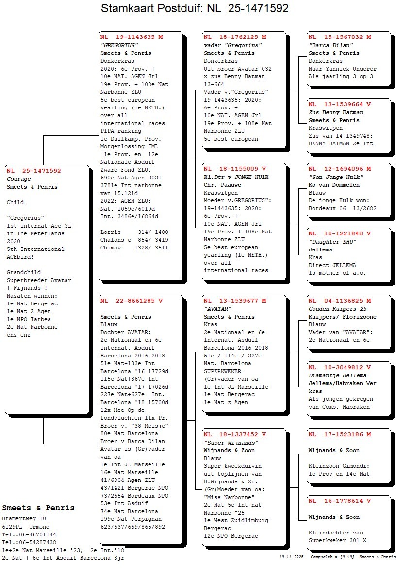 Father = “GREGORIUS” 5th International Ace Yearlings Extreme Marathon PiPa ranking (1st Dutch pigeon) & grandson of “BARCA DILAN” (brother “AVATAR”)
