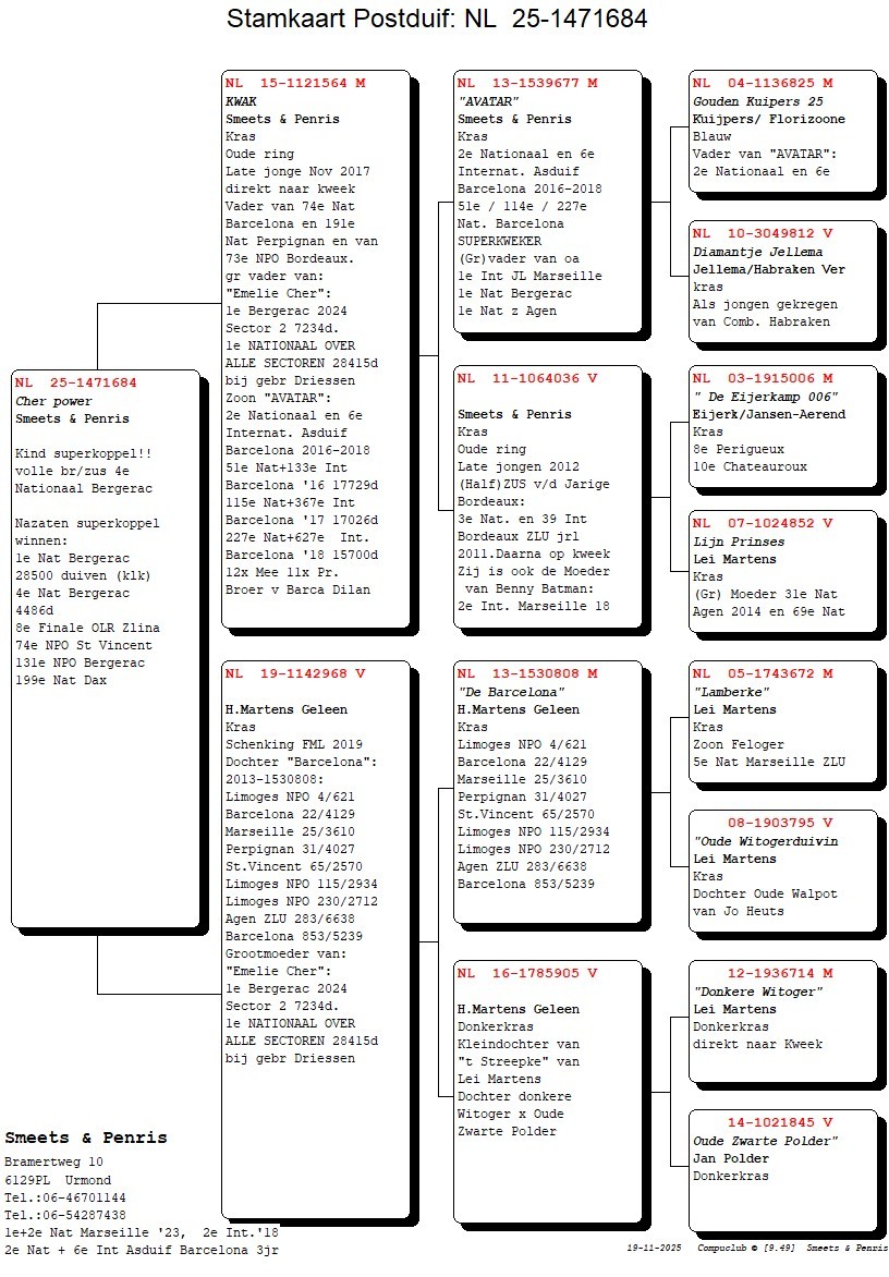 Father of 74 National Barcelona, 191 National Perpignan and grandfather of “EMELIE CHER” 1st National s2 Bergerac 7.234 p. & 1st National Bergerac 28.415 p. overall ’25 (Gebr. Driessen) !