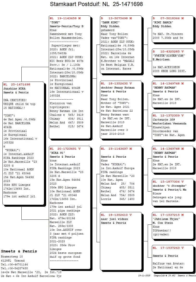 “BENNY BATMAN” is (grand)father of the 1st National Marseille, 2nd National Marseille, 4th National Agen ZLU, 6th National Barcelona, 8th Ace OLR Derby Avirings Slovenia, 10th National Agen ZLU, 19National Agen ZLU, etc …!
