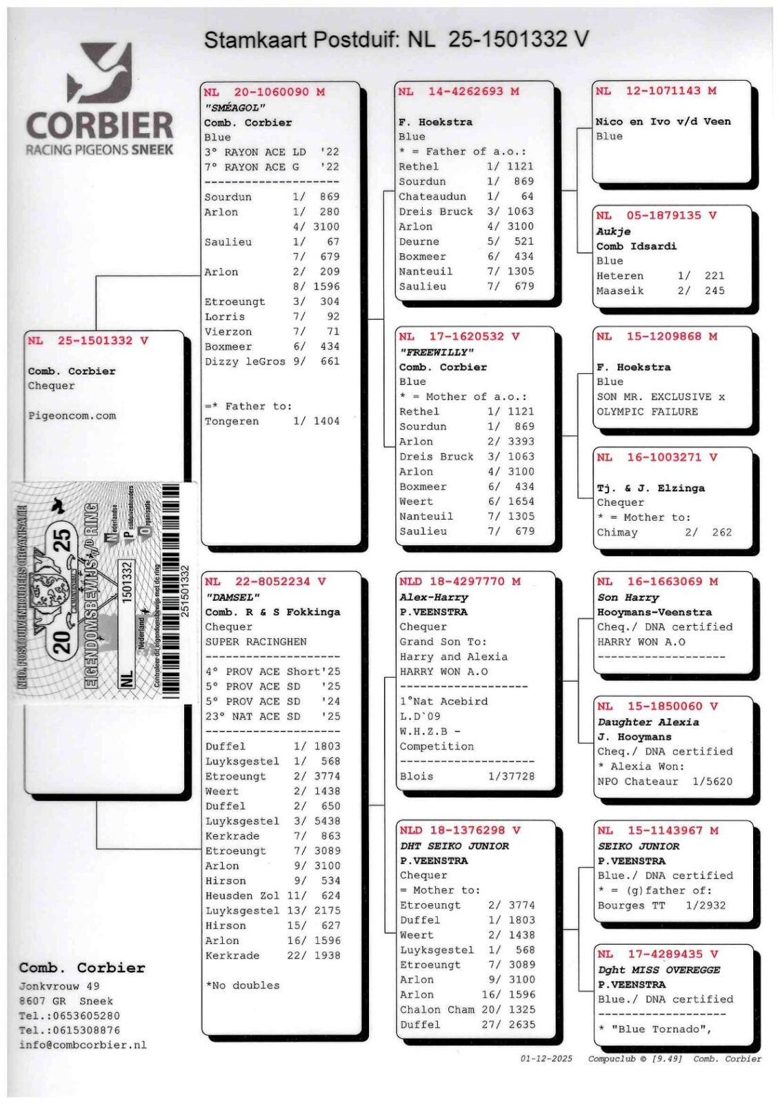 Daughter “SMEAGOL” 3x 1st prize winner, 3rd Ace Long Distance NPO Dpt. 11 Friesland Rayon (and already father of 1/1.404 Tongeren) x “DAMSEL” 2x 1st prize winner, 3x 2nd prize winner, 10x top 9 no doubles, 4th Provincial Ace SD ’25, 5th Provincial Ace SD ’24, 23rd National Ace SD The Netherlands ’25 !!