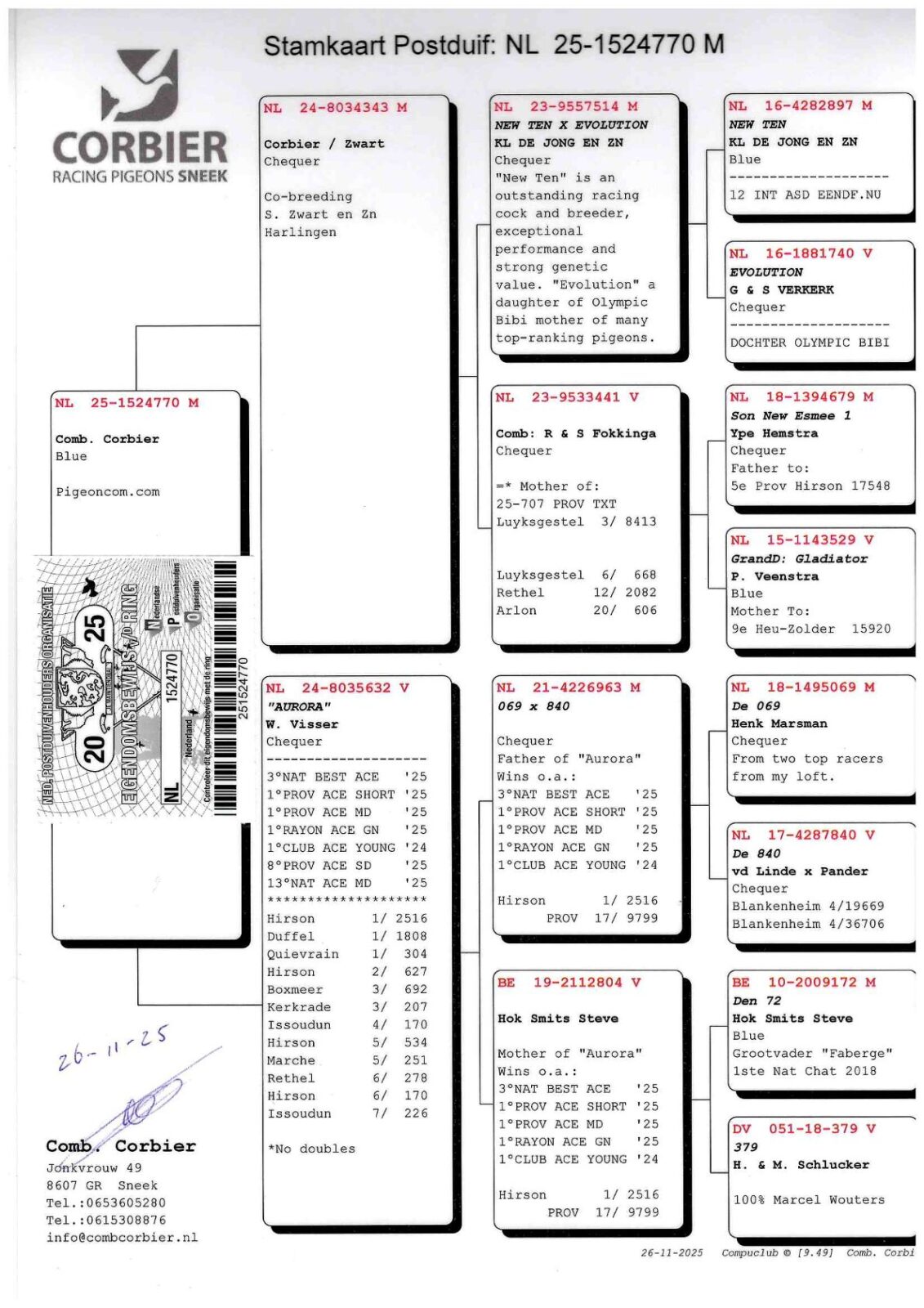 Exclusive son of “AURORA” 3rd NATIONAL ACE ALLROUND ’25 THE NETHERLANDS !! A sublime pigeon, one of the very best of The Netherlands in 2025 !!