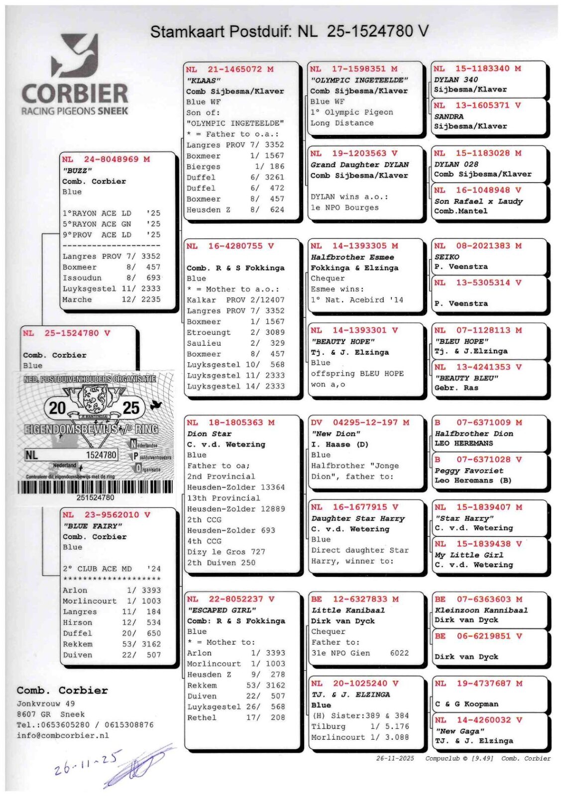 Daughter of “BUZZ” 1st Ace Long Distance NPO Dpt. 11 Friesland Rayon ’25, 9th Provincial Ace LD Friesland ’25 (grandson “OLYMPIC INGETEELDE” 1st Olympic Pigeon Long Distance The Netherlands) x “BLUE FAIRY” 1st Arlon 3.339 pigeons, 1st Morlincourt 1.003 pigeons !!