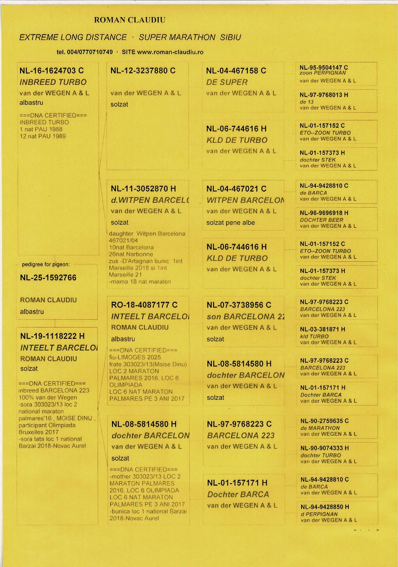 100% A. & L. VAN DER WEGEN !!! Inbreed “DE TURBO” 1st National Pau, “BARCELONA 223” 10 National Barcelona, 26 National Narbonne (his sister wins 1st International Marseille), “WITPEN BARCELONA” offspring win 1st National Barzai Romania, Olympic Marathon pigeon Bruxelles 2017 !!