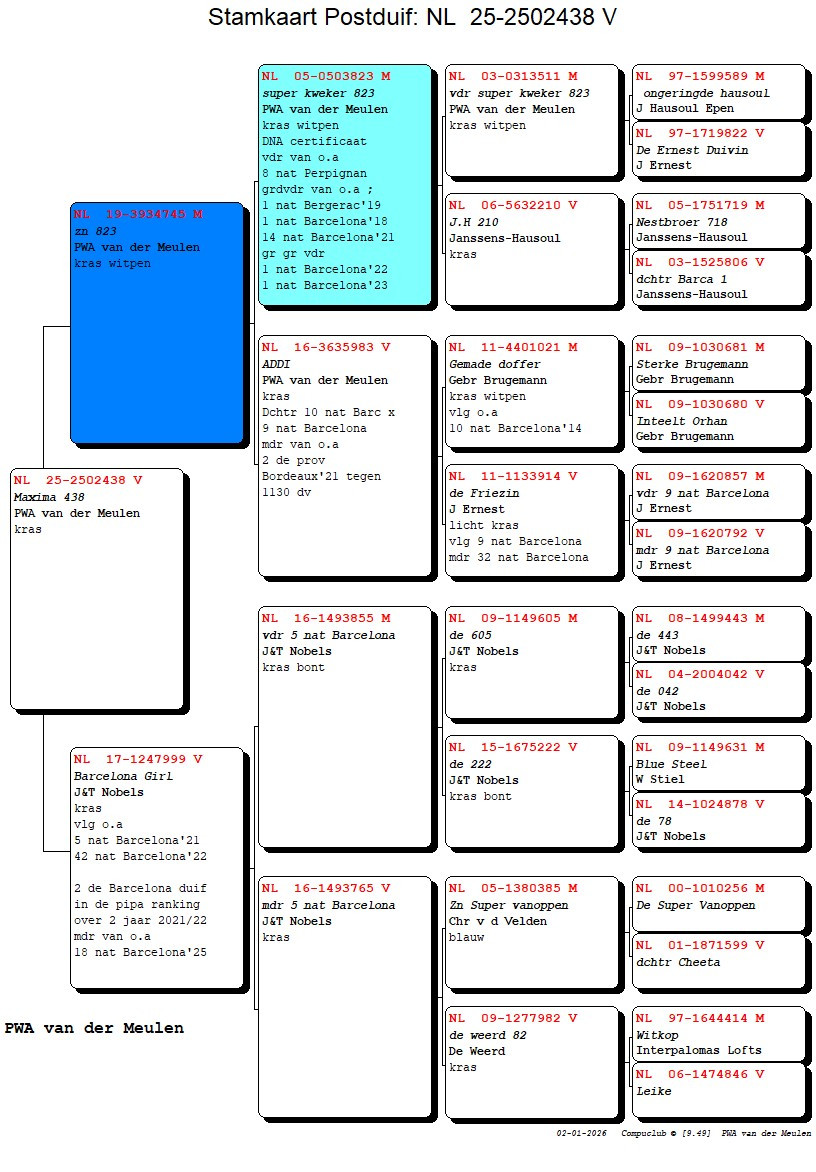 Son superbreeder “DE 823” x “BARCELONA GIRL” 2nd International Ace Barcelona 2 yr 2021-2022, 5 National Barcelona, 42 National Barcelona and mother of 18 National Barcelona ’25 !