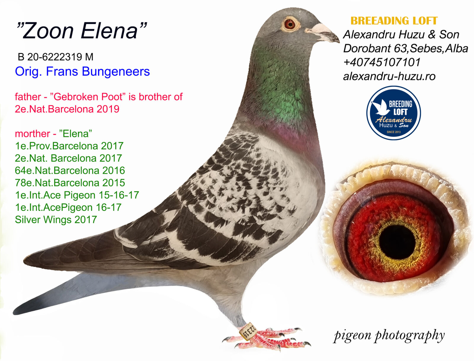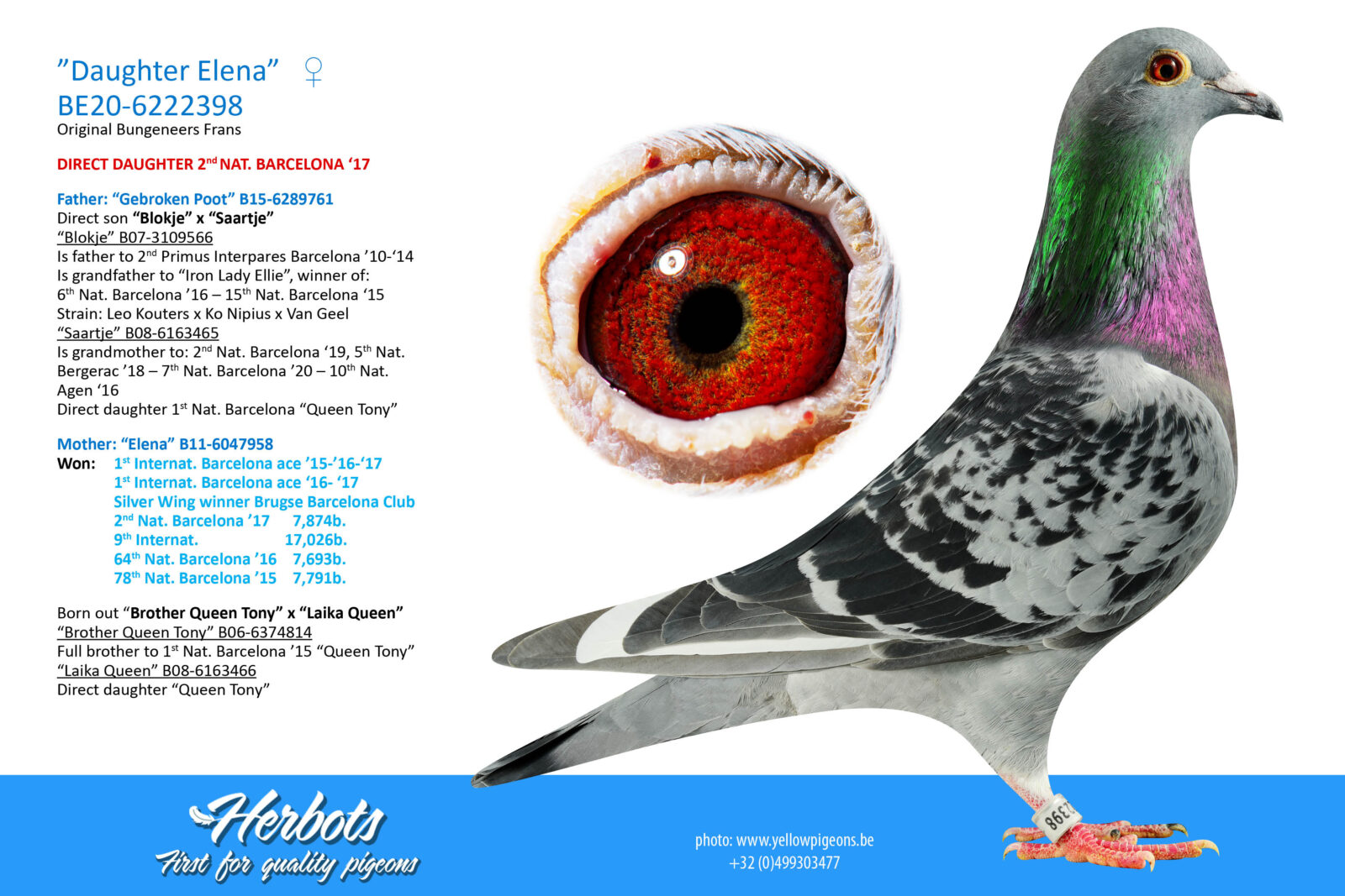 Son “GEBROKEN POOT” grandfather 2nd National Dax KBDB ’25 x “ELENA” paired to daughter “GEBROKEN POOT” x “ELENA” 1st International Ace Barcelona 3yr 2015-1017, 2nd National Barcelona, 64th National Barcelona, 78th National Barcelona !!!