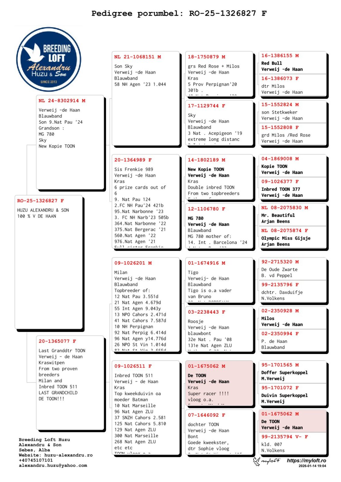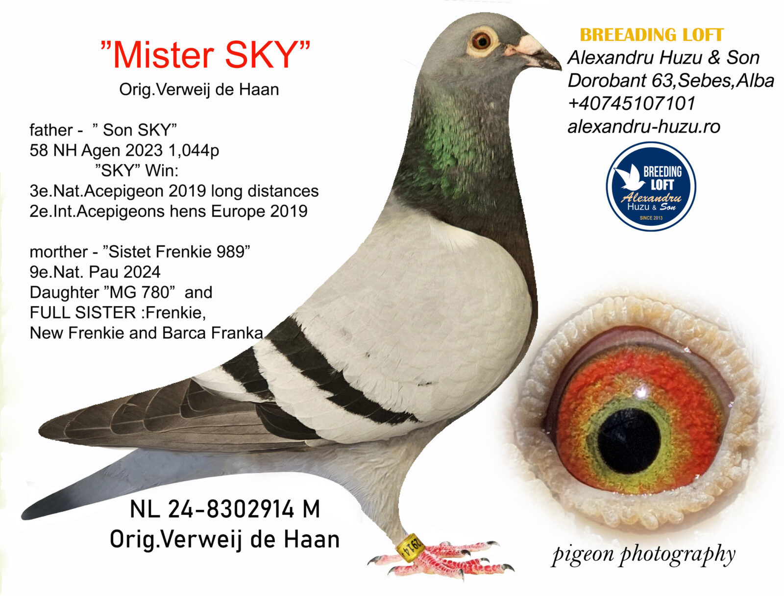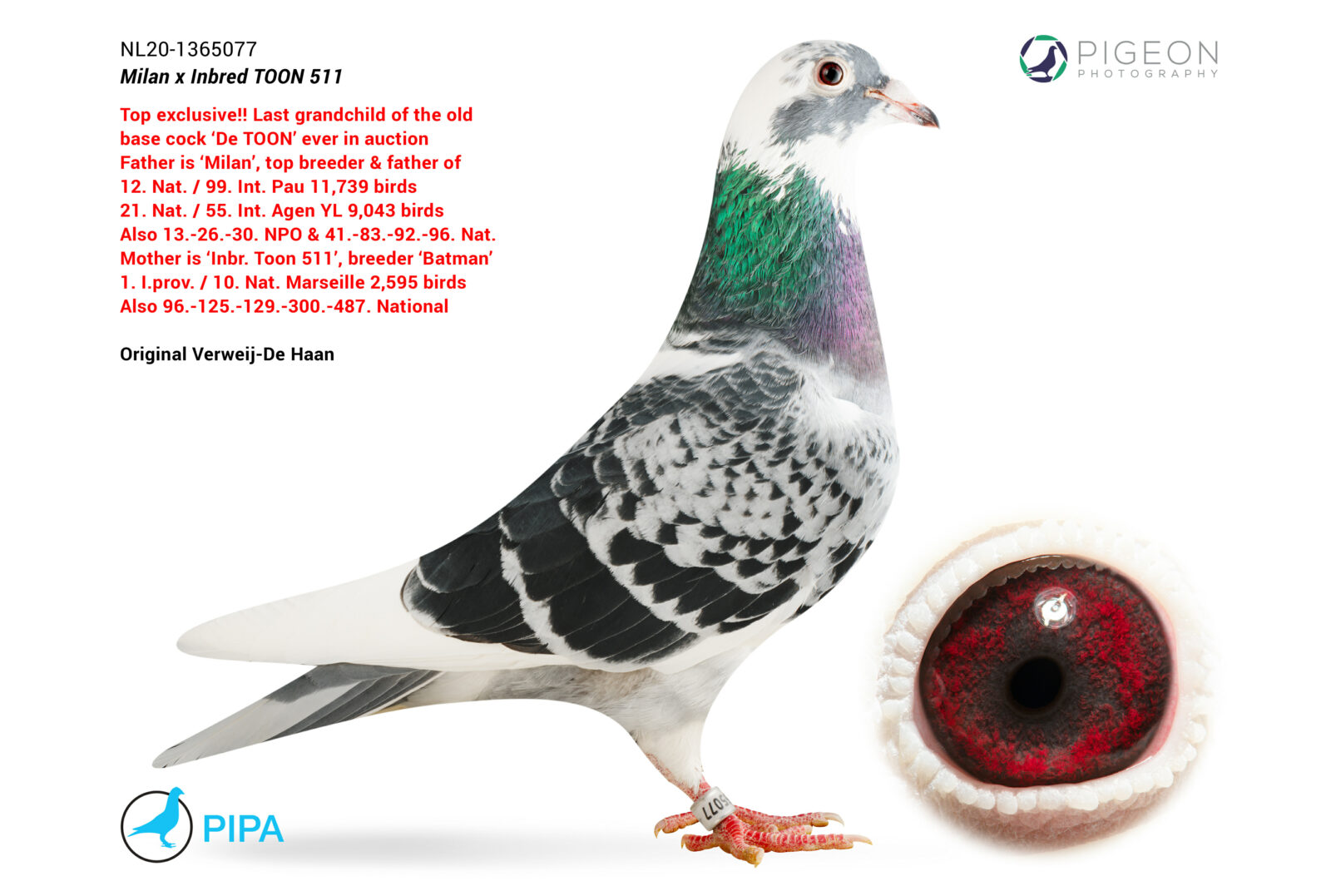 Last granddaughter of the famous basic breeder of Verweij-de Haan “DE TOON” x son 9th National Pau, sister “FRENKIE” 2nd National Ace ZLU ’19 x son “SKY” 3rd National Ace ZLU ’19 and 2nd International Ace (F) Extreme Marathon Pipa ranking ’19 !!